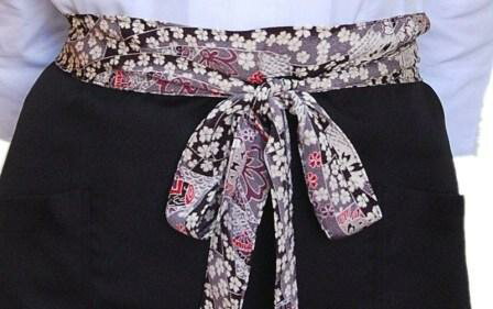 和風エプロン40cm丈 和柄帯使い サロンエプロン黒Xグレー ヒモ【日本製】